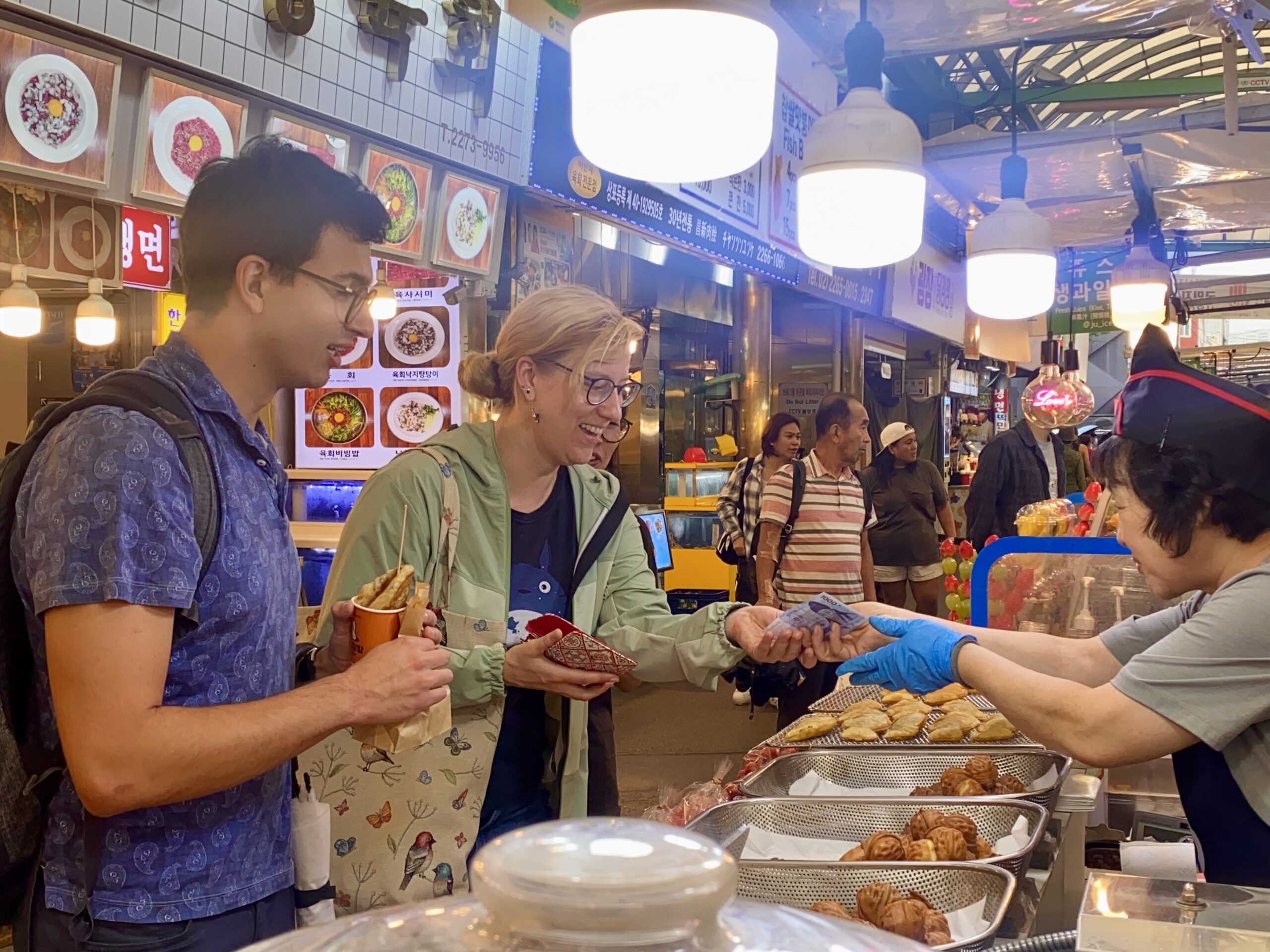 We took a bus to get there, and the moment we stepped into the market, we were greeted by an explosion of delicious sights and smells. Right in the center, several Korean women were busy frying up mung bean pancakes (nokdu bindaetteok) — a signature dish of the market, known for being thick, crispy, and incredibly tasty.