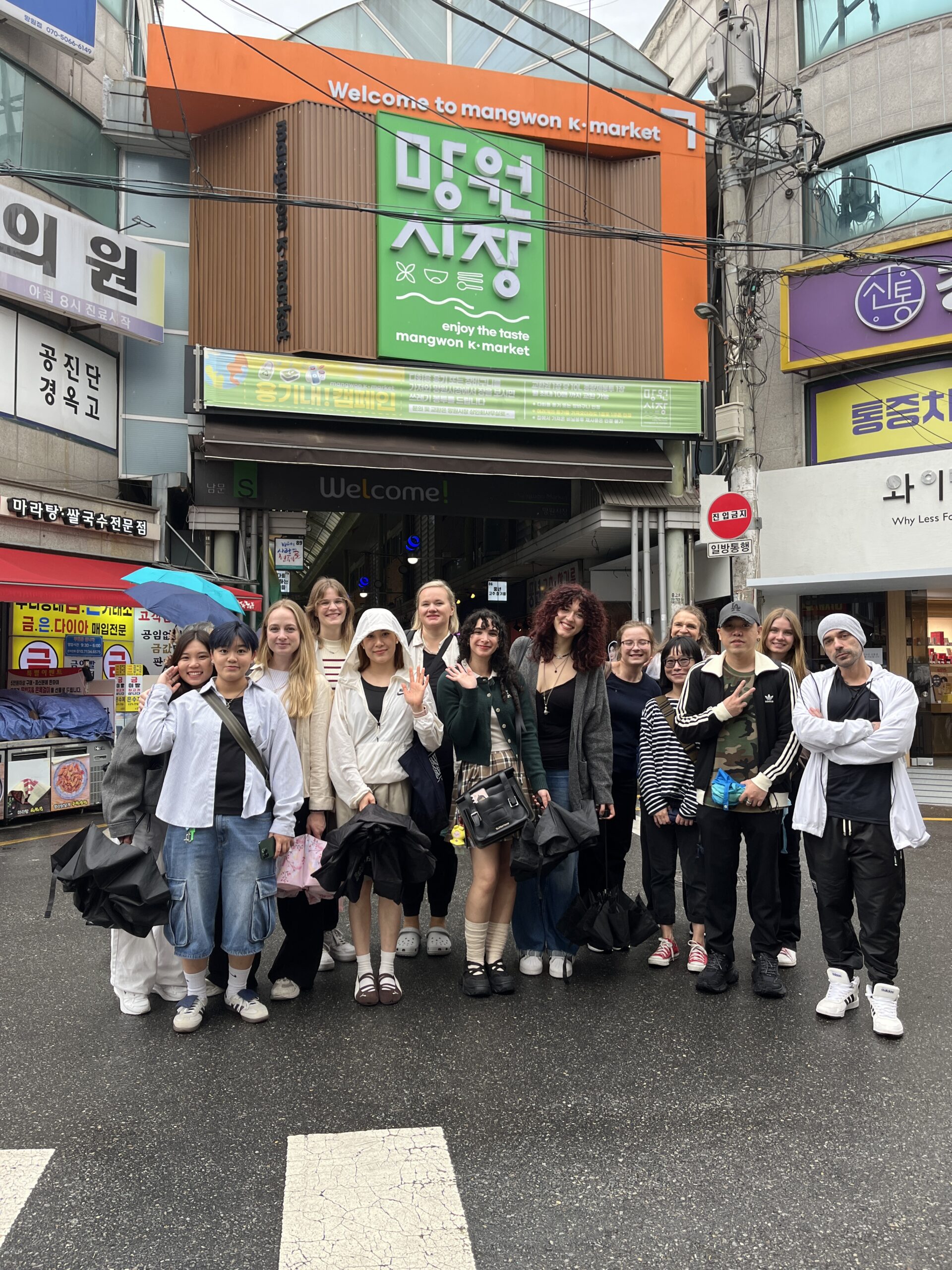 학원에서 버스를 타고 망원시장에 갔어요. 버스를 처음 타보는 학생도 있어서 재미있는 경험이 되었어요. 안타깝게도 비가 와서 우산을 써야 했지만 아주 많이 오는 비는 아니어서 다행이에요. 내려야 하는 정류장을 놓칠까봐 조마조마 했어요. ‘다음은 망원시장입니다.’ 앗! 여기예요! 우리는 모두 안전하게 시장에 도착했답니다.