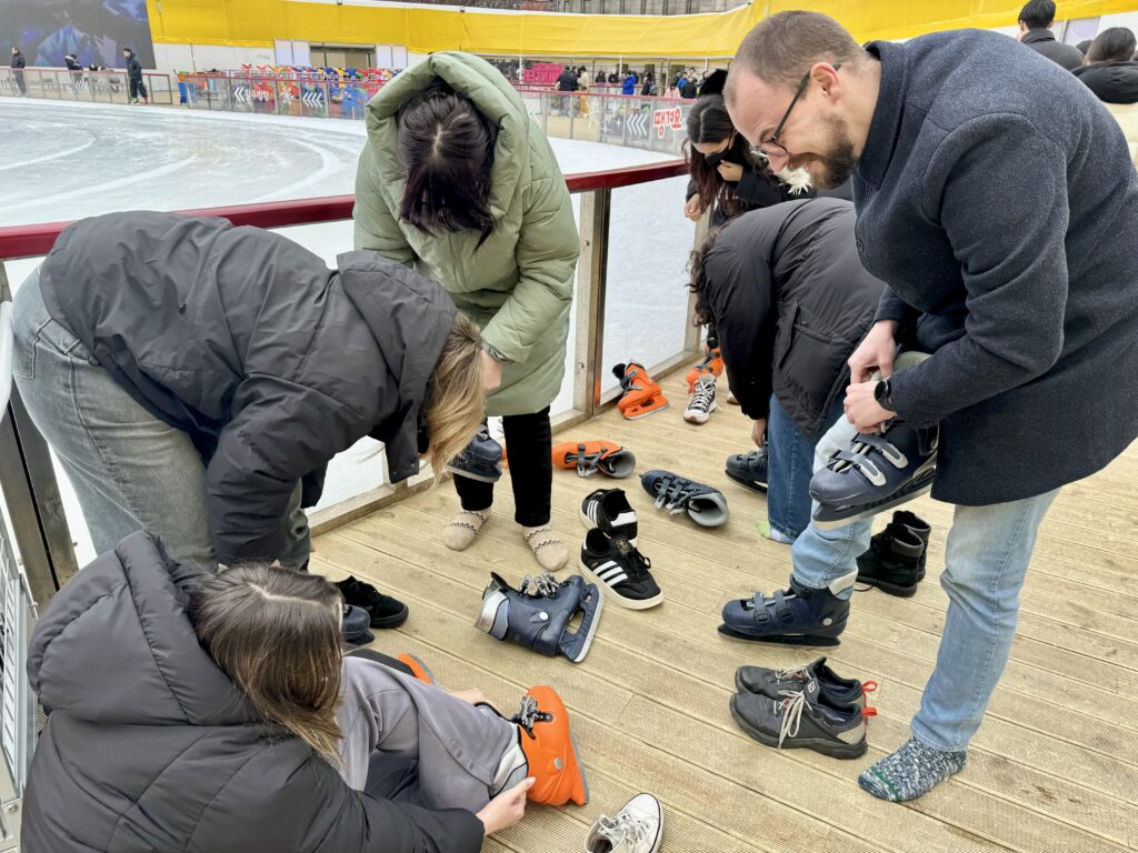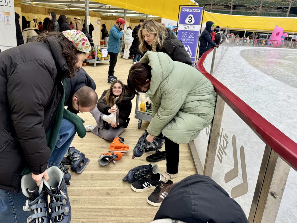 우리는 미리 알아본 한국 신발 사이즈를 말하고 스케이트를 대여했어요.