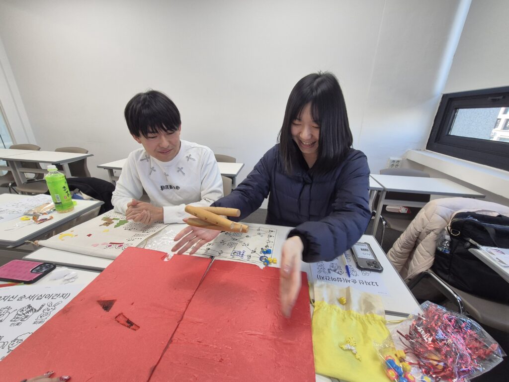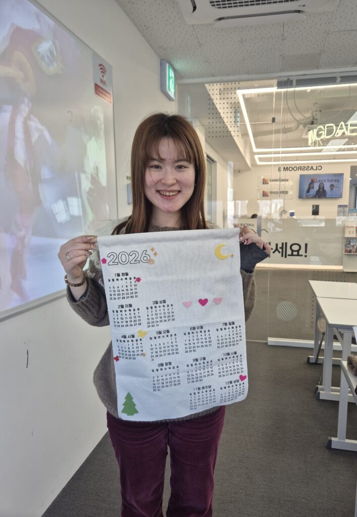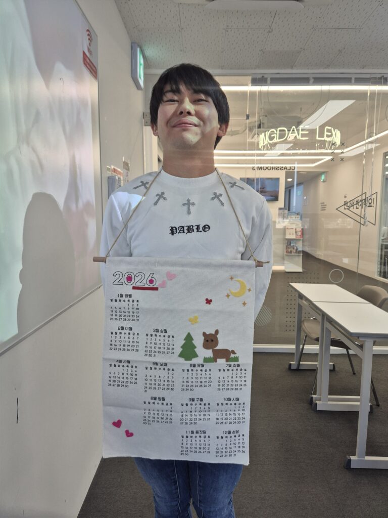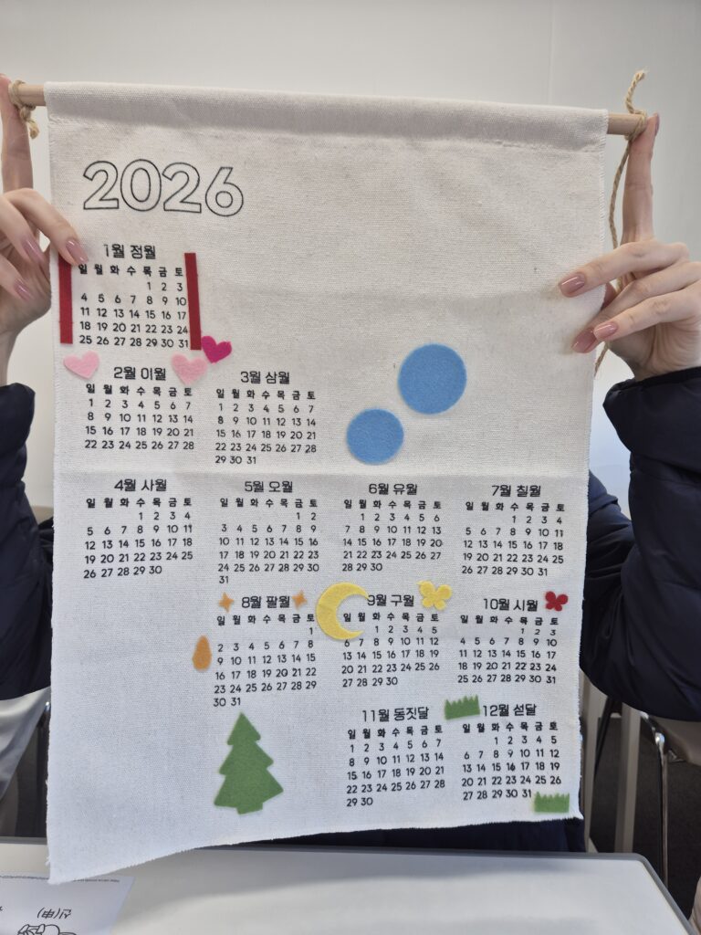 이 십이간지 동물들에 대해 배우고 초성퀴즈도 하며 상품으로 받은 간식도 먹으면서 2026년 달력을 만들기 시작했어요.