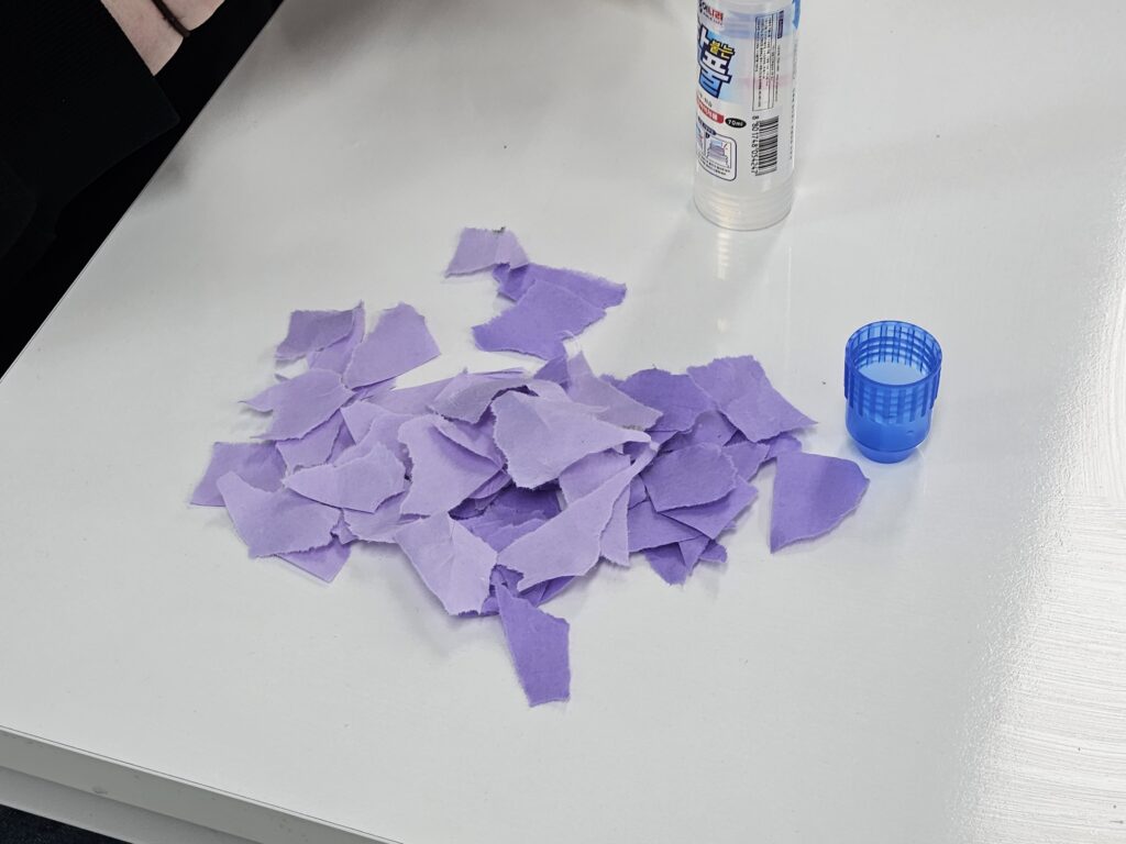 We used traditional Korean paper called hanji to make the masks. First, we tore the hanji into small pieces by hand and attached them to the mask using glue. Then, we decorated them with colored pencils and markers to complete our unique masks.