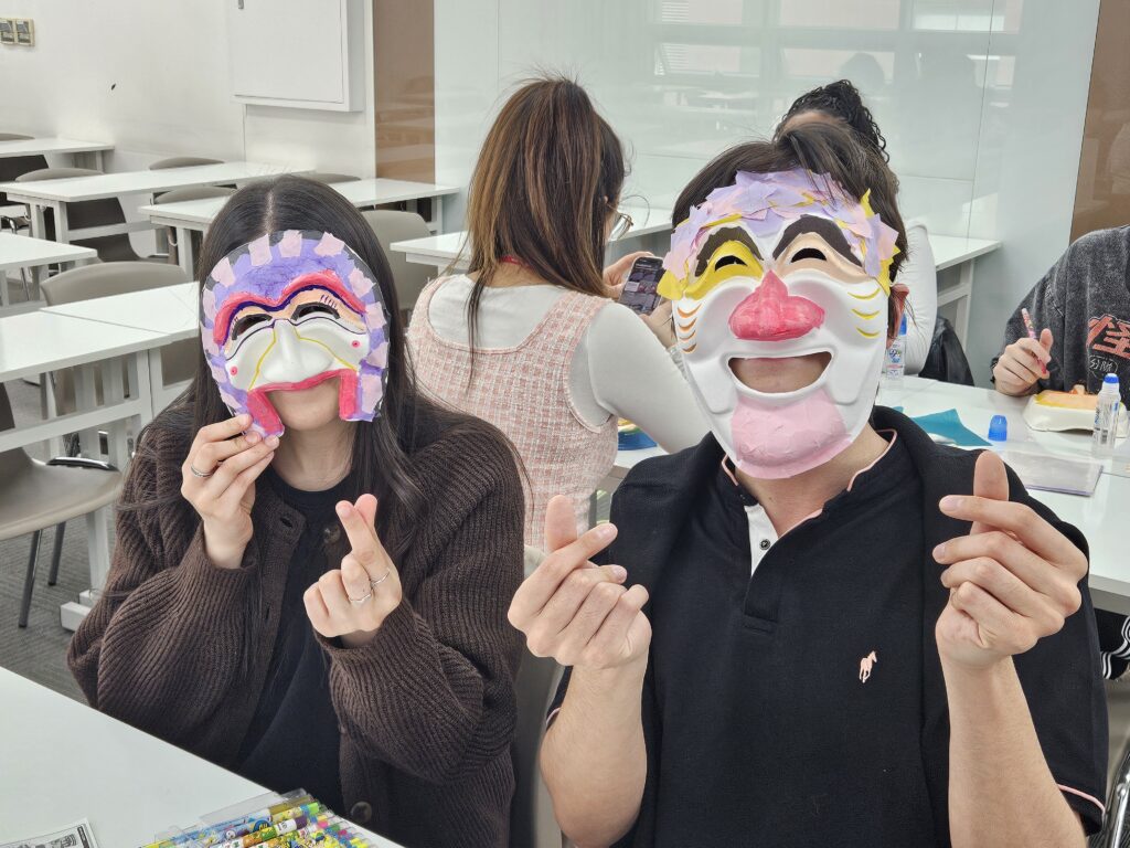 After finishing our masks, we watched a video of traditional Korean mask dance together. Then, we wore the masks we made and tried dancing the traditional mask dance ourselves.