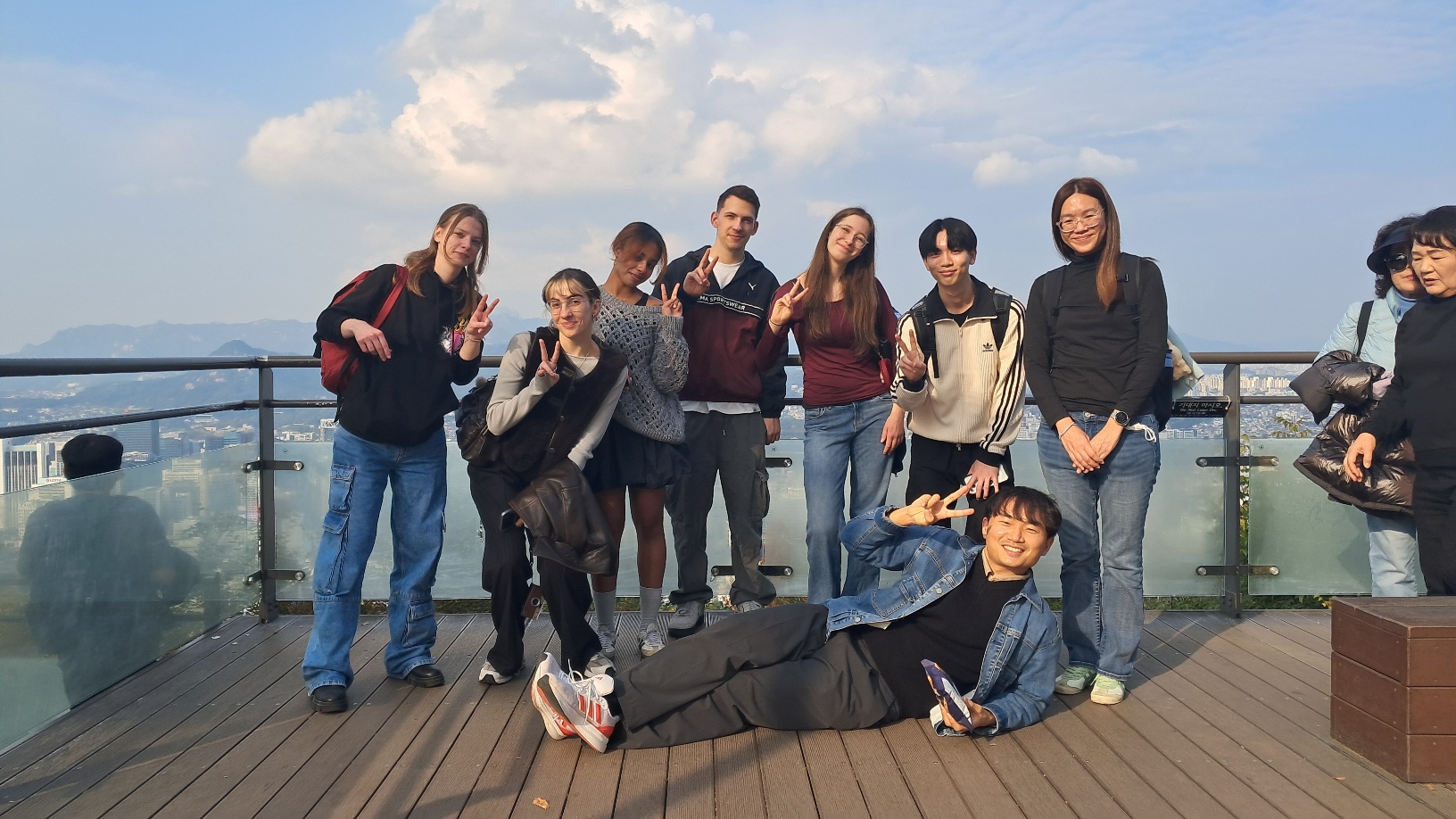 After walking up the hill, we took a group photo at the Namsan observatory! Everyone was enjoying the beautiful view of Seoul spread out before us, and we captured that joyful moment as a wonderful memory in a photo!