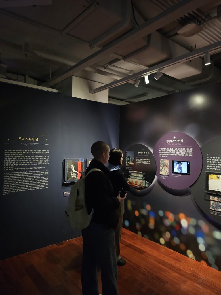 마침 박물관에서는 특별전 〈밤풍경〉이 열리고 있었어요. 조선시대의 고요한 밤부터 통금 시절의 긴장된 밤, 그리고 오늘날 자유롭고 화려한 밤까지 시대별로 달라진 한국의 밤을 한눈에 볼 수 있었어요. 외국인 학생들도 흥미롭게 관람하며 한국의 밤 문화가 어떻게 변해왔는지 많은 질문을 던졌어요