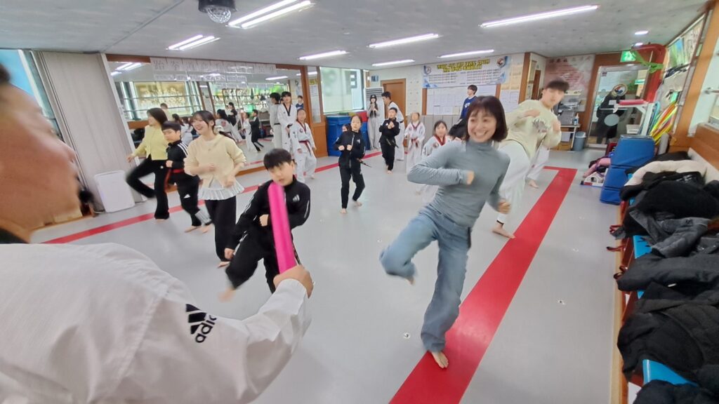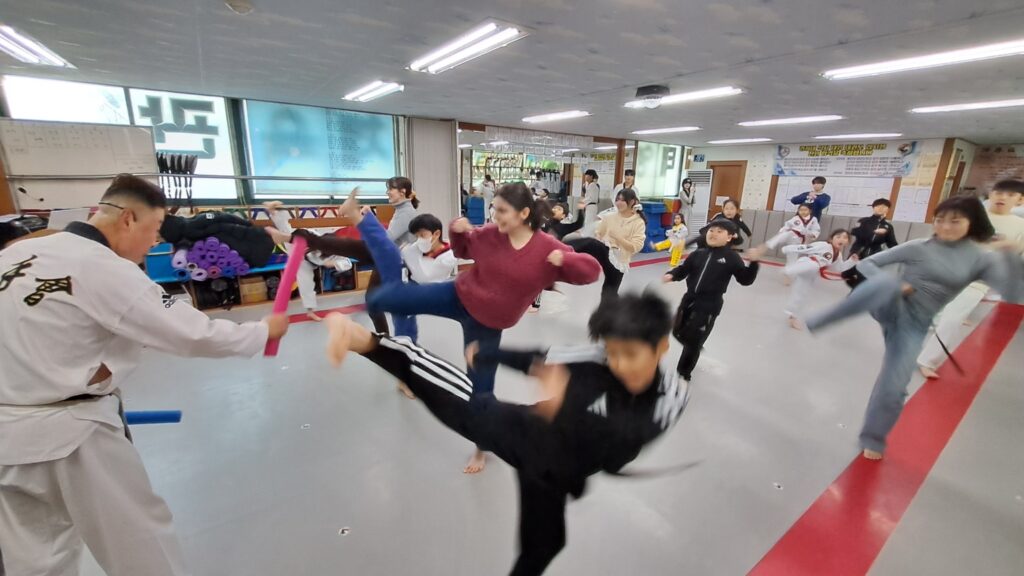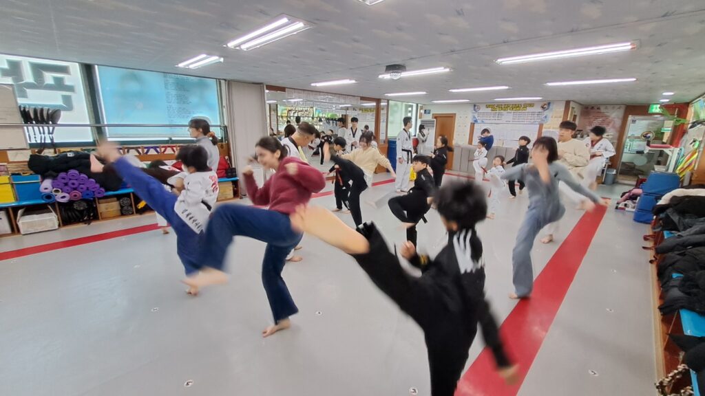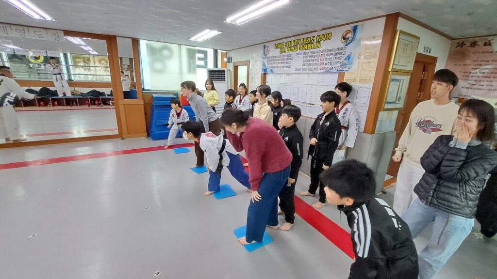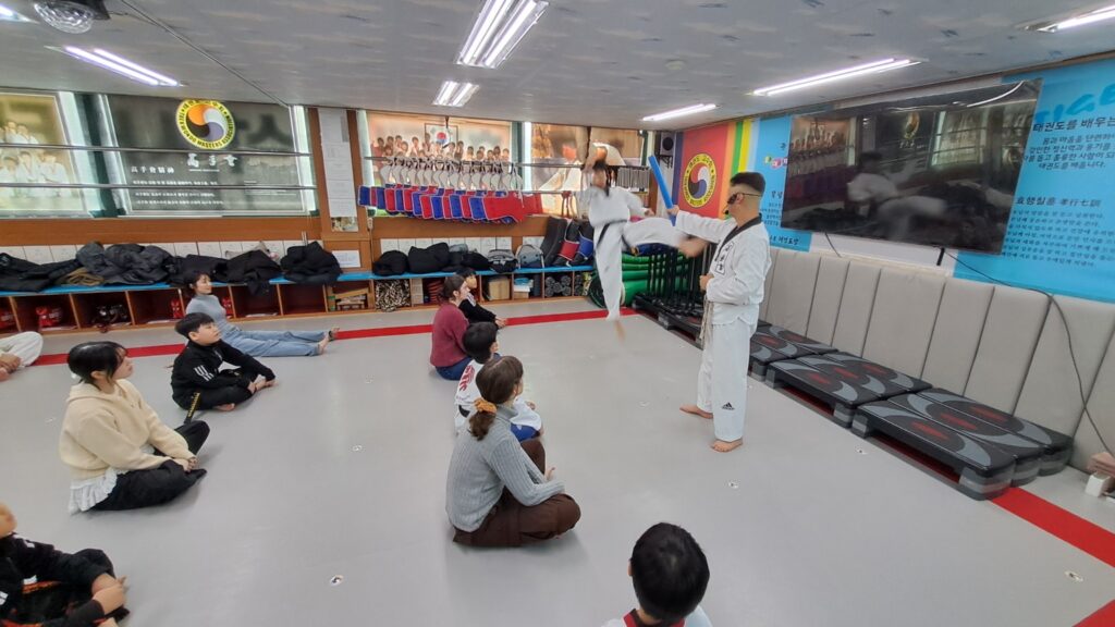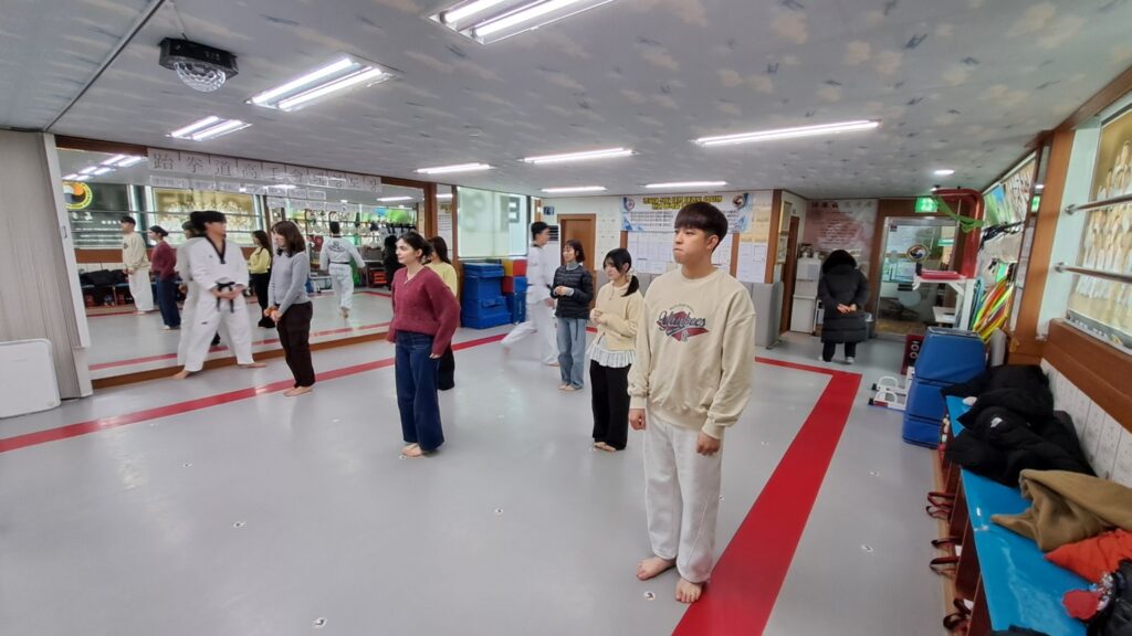 Hello! This Friday, we had the opportunity to participate in a Taekwondo class!! It was a great chance to experience Taekwondo firsthand, a traditional Korean martial art.