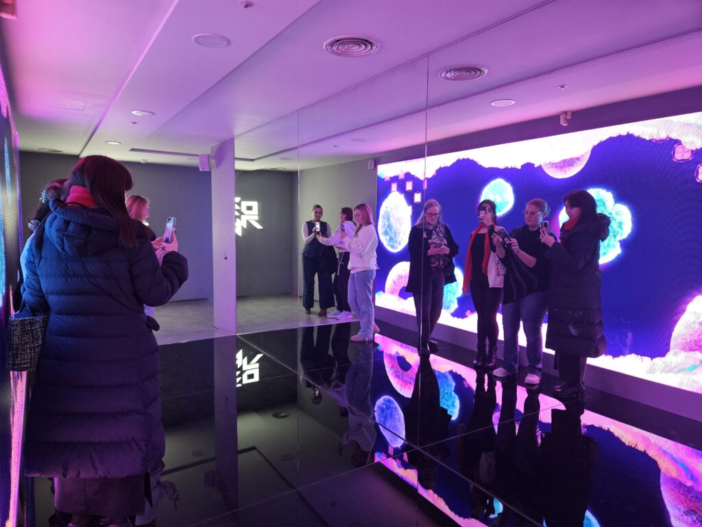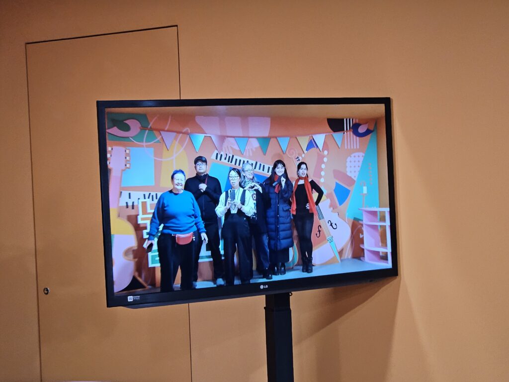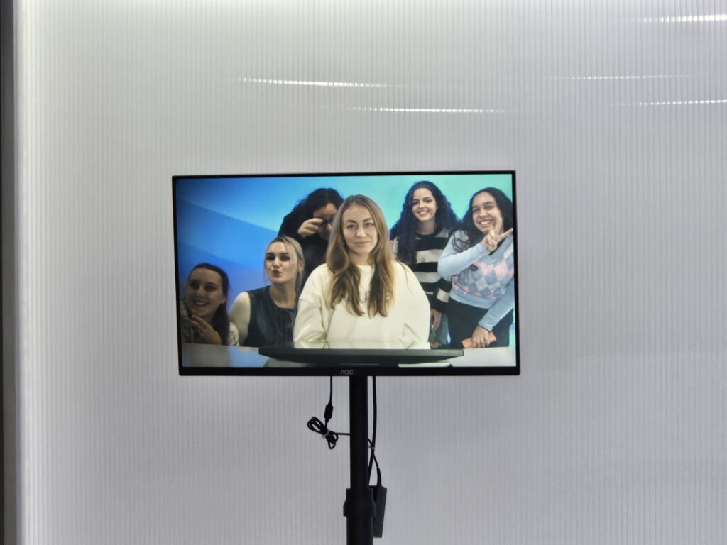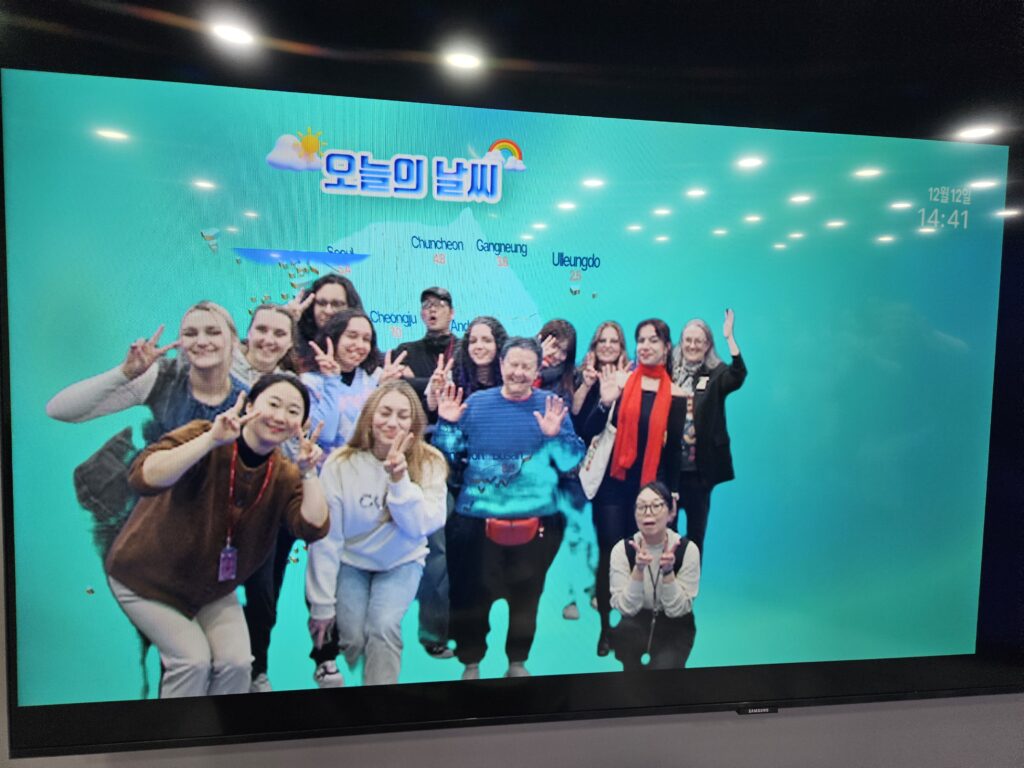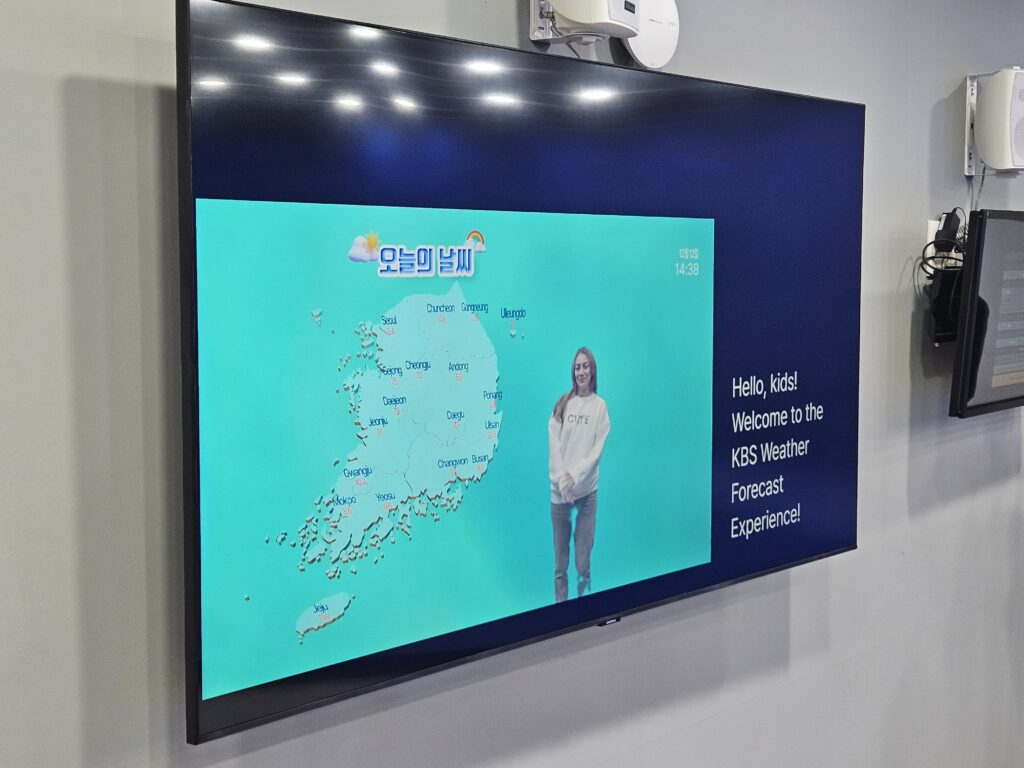 Standing in front of a blue screen that suits East Asian skin tones well, we explained the weather in Seoul, Daejeon, and Jeju and watched ourselves on the screen. If you wear clothes that are similar in color to the screen, your body might disappear on the screen! After taking photos together, we moved on to the next experience.